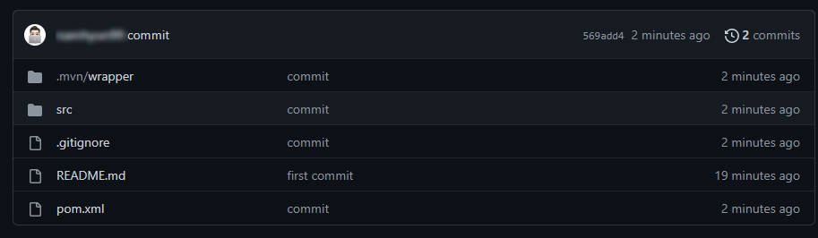 README.md를 업로드하고 추가로 프로젝트 파일들도 업로드해 주었다. 아래와 같이 업로드가 잘된 걸 확인할 수 있다. 물론 의도대로 되지 않은 것도 있다. mvn.wrapper는 올리고 싶었던 것이 아니다. 이걸 gitignore에서 다시 설정해 주면 될 것 같다.