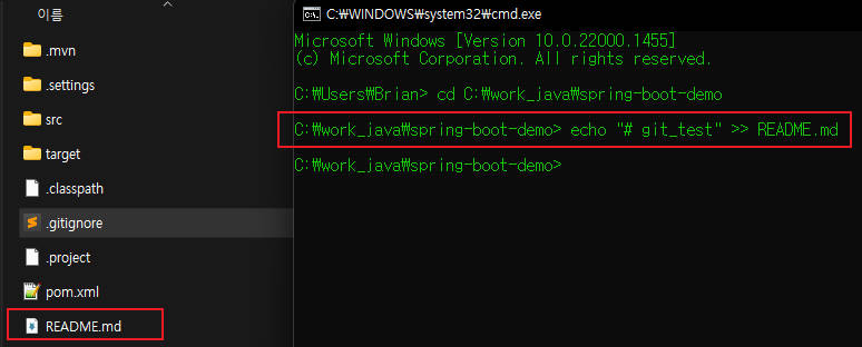 아래와 같이 명령어를 입력하면 README 파일이 위에서 이동한 경로에 생성된다.
