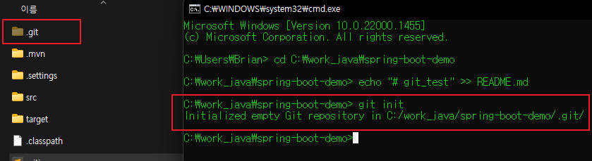 아래와 같은 명령어를 입력하면 프로젝트 폴더에 .git 폴더가 생성된다.