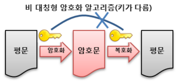 - 암호화와 복호화에 서로 다른 키가 사용되는 방식