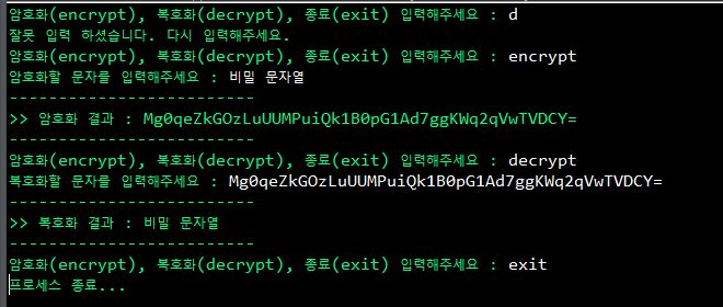 System.out.print("암호화(encrypt), 복호화(decrypt), 종료(exit) 입력해주세요 : ");