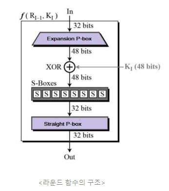 - 입력값으로 들어온 32비트를 48비트로 확장한 후 라운드 함수 키 48비트와 XOR