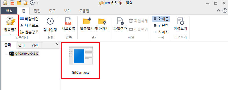 그 후 압축파일을 풀어줍니다. 압축파일을 풀고 나면 gifcam.exe 실행파일이 하나 보입니다.