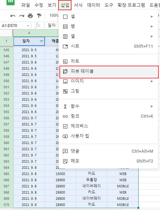 ① 우선 피벗테이블을 작성하기 앞서 rowdata 즉 기초가 되는 데이터를 작성해줍니다.