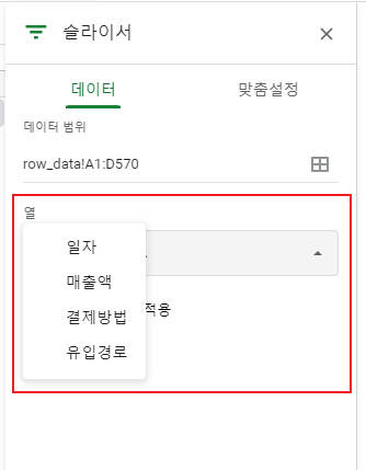 이후 우측에 슬라이서 설정창이 뜨는데 어떤 열을 기준으로 슬라이서를 적용할 것인지 선택해주시면 됩니다.