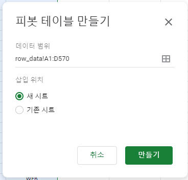 데이터 범위를 확인한 후, 새 시트에 만들것인지 기존 시트에 만들어 줄지 선택해주면 됩니다. 저는 새 시트로 만들어 보겠습니다.