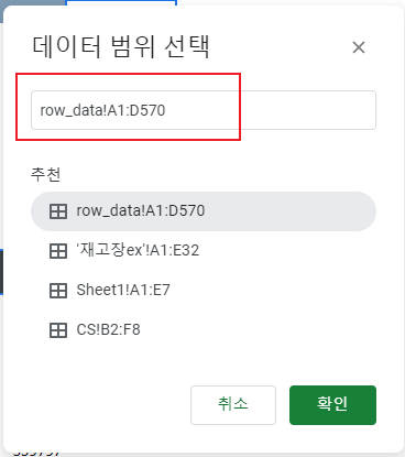 ② 여기서 중요한점은 데이터 범위를 선택해주어야 하는데 해당 데이터는 피벗테이블을 만들 때 사용하였던 rowdata데이터 시트를 불러와 줍니다. 추천에 뜨는 경우도 있지만 추천에 뜨지 않으면 해당 시트로 이동하여 직접 선택해 줍니다.