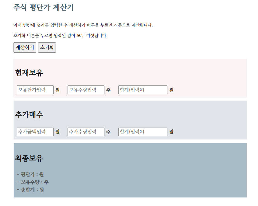 주식 평단가 계산기는 주식 물 타기 할 때 유용한데요. 별도 프로그램을 다운로드할 필요 없이 웹상에서 바로 사용 가능한 주식 평단가 계산기를 HTML과 JavaScript로 구현해봤는데요. 그럼 어떻게 사용하는지 알아볼까요?