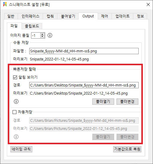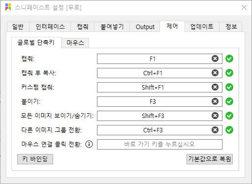 그 외 캡처/붙여 넣기/Output/제어/업데이트/정보 탭으로 나누어져 있어 다양하게 설정 후 사용할 수 있습니다.