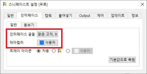 인터페이스 탭 > 테마컬러 설정 : 테마컬러는 캡처 시 나타나는 테투리 창입니다.
