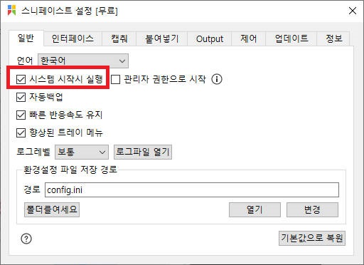 ② 일반 탭 > 시스템 시작 시 실행 설정 : 해당 부분을 설정해 주어야 윈도우 시작 시 자동 실행되어 응용프로그램을 실행하지 않아도 편리하게 사용할 수 있습니다.