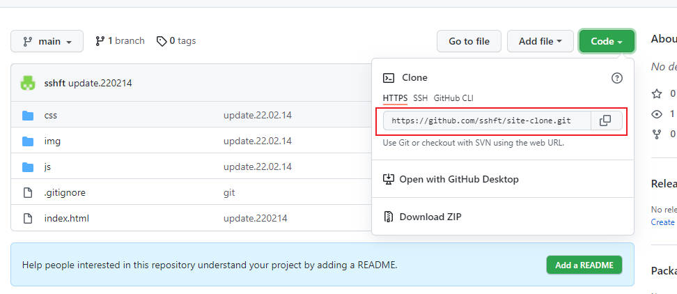 그럼 아래와 같이 Repositories가 생성되며 Code버튼을 눌러 주소를 복사해줍니다.
