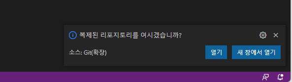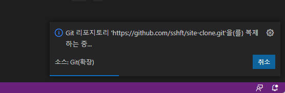 ⑤ 위치를 선택해주면 github에 있는 소스코드를 vs code로 복제하기 시작합니다.