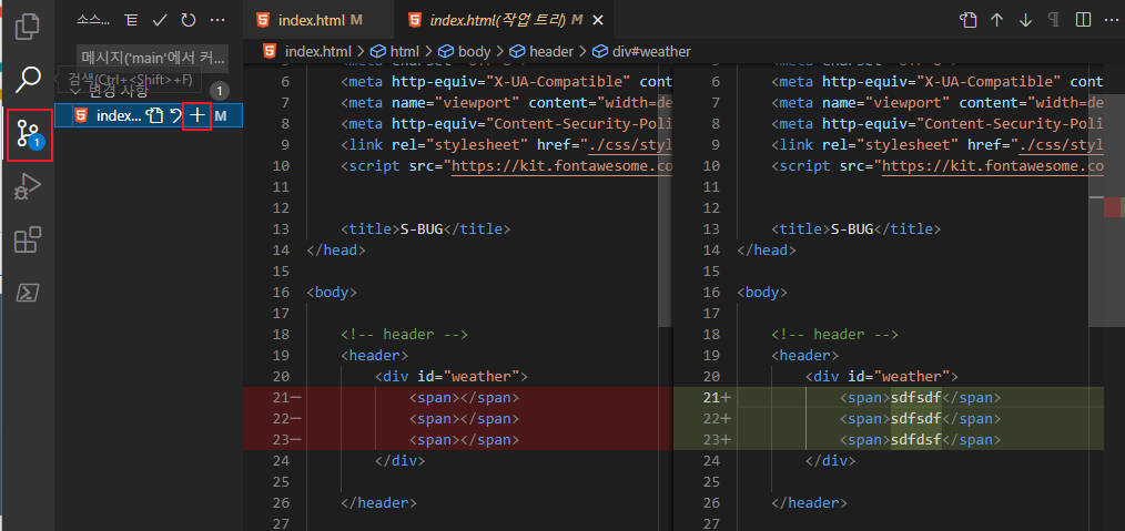 ① 불러온 코드들을 vs code에서 수정하고 저장하면 아래 화면처럼 좌측 세 번째 아이콘처럼 나타난다. 코드 수정이 다 되었다면 여러 개가 있을 겁니다. 여기를 클릭한 후 + 버튼을 눌러줍니다.