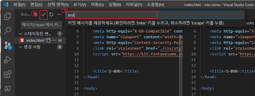 ② 그럼 스테이징된 변경 사항으로 이동되고, 그 위에 체크 버튼을 눌러준 후 commit 메시지를 입력한다.