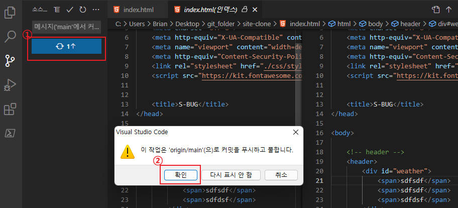 ① 불러온 코드들을 vs code에서 수정하고 저장하면 아래 화면처럼 좌측 세 번째 아이콘처럼 나타난다. 코드 수정이 다 되었다면 여러 개가 있을 겁니다. 여기를 클릭한 후 + 버튼을 눌러줍니다.