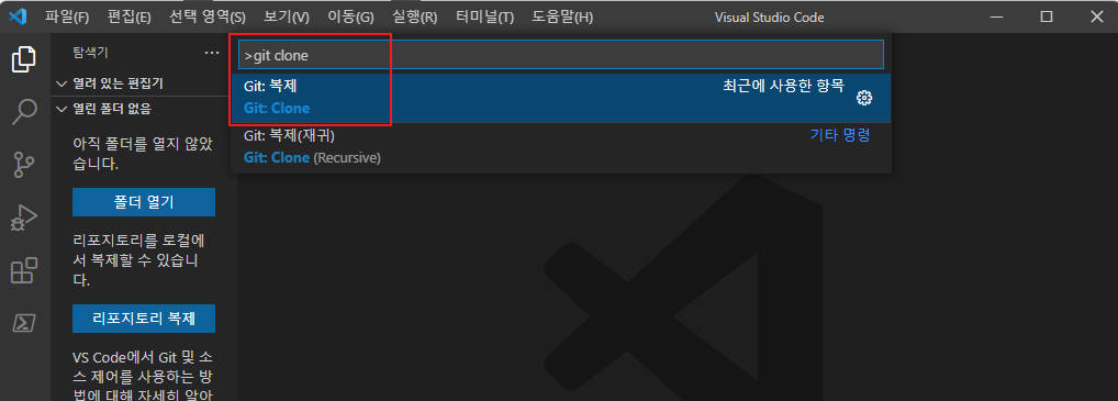 ② vs code로 돌아와서 F1 누른 후 git clone이라고 검색 후 아래 부분을 선택해 줍니다.