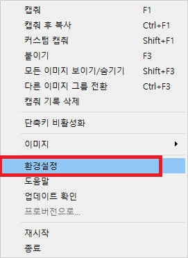 ① 트레이 쪽에 있는 snipaste 아이콘에 우측 마우스를 클릭 > 환경설정 선택