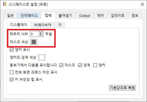 인터페이스 탭 > 테마컬러 설정 : 테마컬러는 캡처 시 나타나는 테투리 창입니다.