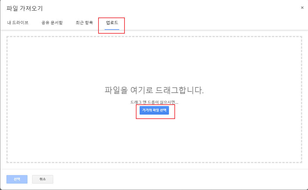 ② 파일 업로드 후 뜨는 팝업창이다 아래 가져오기 위치를 선택한 후 불러와 주면 된다.