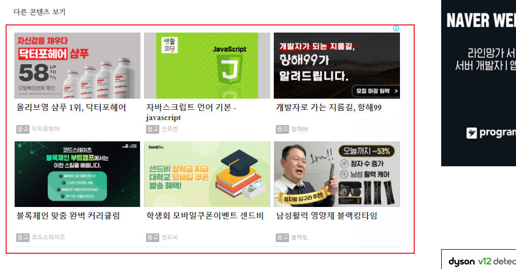 이제 사이트 내에 노출이 잘 되는지 확인해보겠습니다. 다른 글들도 검색해보니 바로 안 나온다. 1시간 뒤에 광고가 나온다 라는 말들이 있는데 저는 다행히도(?) 바로 노출되는 걸 확인할 수 있었습니다. 물론 모바일에서도 잘 떠요!