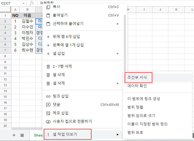 ① 조건부 서식을 적용할 범위를 지정한 후, 메뉴에서 [서식] > [조건부 서식] 메뉴를 선택하거나, 우측 마우스 클릭을 하면 [셀 작업 더보기]에서 조건부 서식을 선택할 수 있습니다. 만약 범위를 수정하고 싶다면 우측 조건부 서식 규칙 창에서 범위를 수정해 주시면 됩니다.