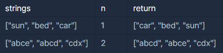 문자열로 구성된 리스트 strings와, 정수 n이 주어졌을 때, 각 문자열의 인덱스 n번째 글자를 기준으로 오름차순 정렬하려 합니다. 예를 들어 strings가 ["sun", "bed", "car"]이고 n이 1이면 각 단어의 인덱스 1의 문자 "u", "e", "a"로 strings를 정렬합니다.