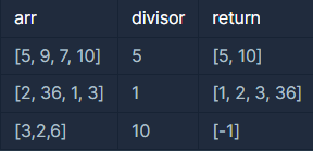 divisor로 나누어 떨어지는 element가 하나도 없다면 배열에 -1을 담아 반환하세요.