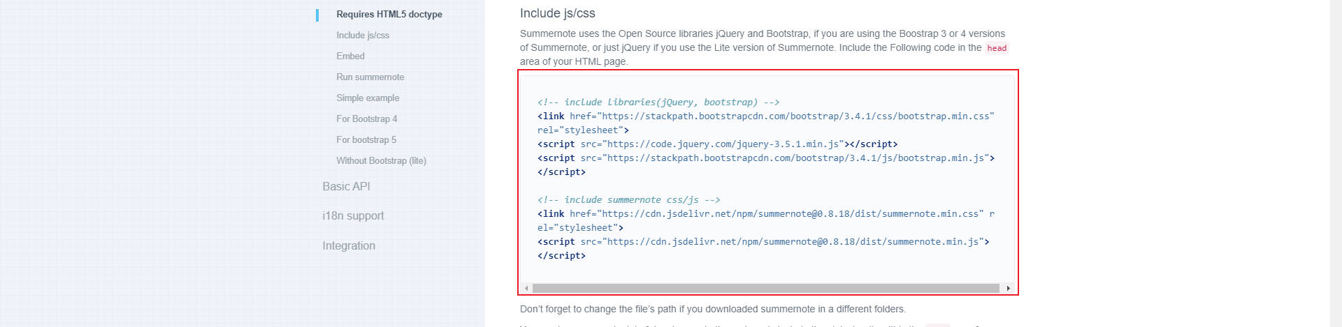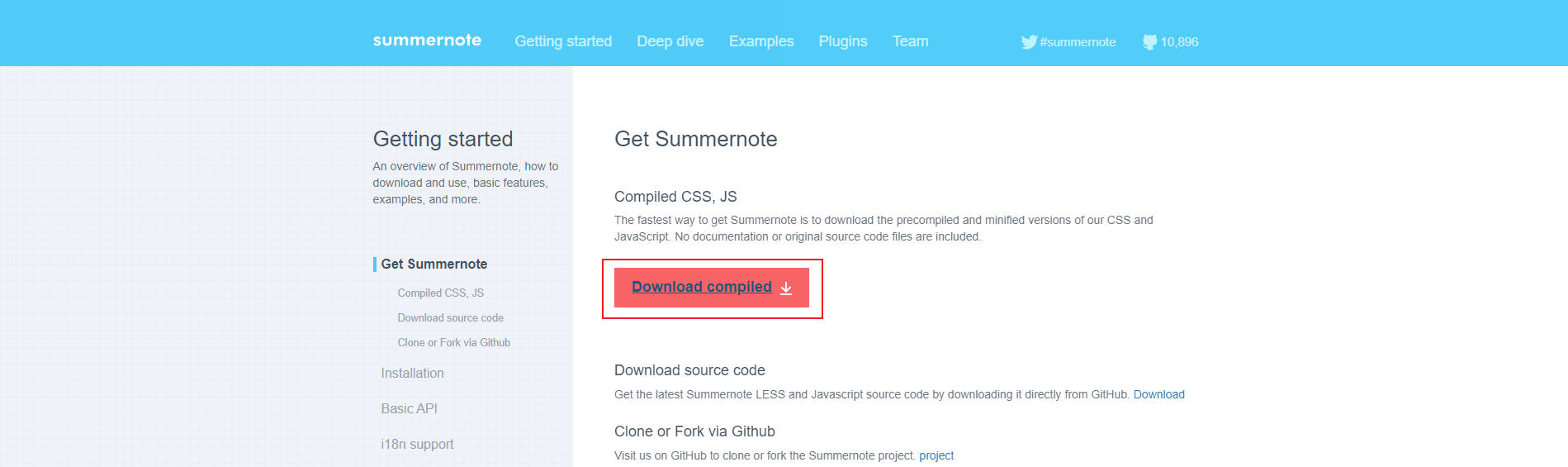 공식 페이지에 접속한 후 상단에 Getting started 메뉴를 누르면 아래와 같이 화면이 나온다. 여기서 js와 css를 다운로드하여 사용할 수 있다. 개인적으로 진행했던 프로젝트에서는 다운로드하여서 원하는 버전으로 사용했다. 공식 문서에 따르면 서머 노트는 부트스트랩 3 또는 4 버전의 서머 노트는 Open Source라이브러리 jQuery 및 부트스트랩을 사용하고, Lite 버전은 jQuery만 사용한다고 한다.